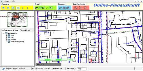 Die Online-Planauskunft ist eine Erweiterung der GIS-Suite der BavariaGIS GmbH und bietet registrierten privaten bzw. gewerblichen Nutzern die Möglichkeit, sich über den Erschließungsstand an einer bestimmten Adresse, z.B. in Vorbereitung des Erwerbs eines zu bebauenden Grundstückes, zu informieren bzw. sich Informationen über die Lage von Anlagen/Leitungen verschiedener Medien zu beschaffen, um diese zur Planung von Bauvorhaben oder bei der Durchführung von Tiefbauarbeiten zu nutzen.